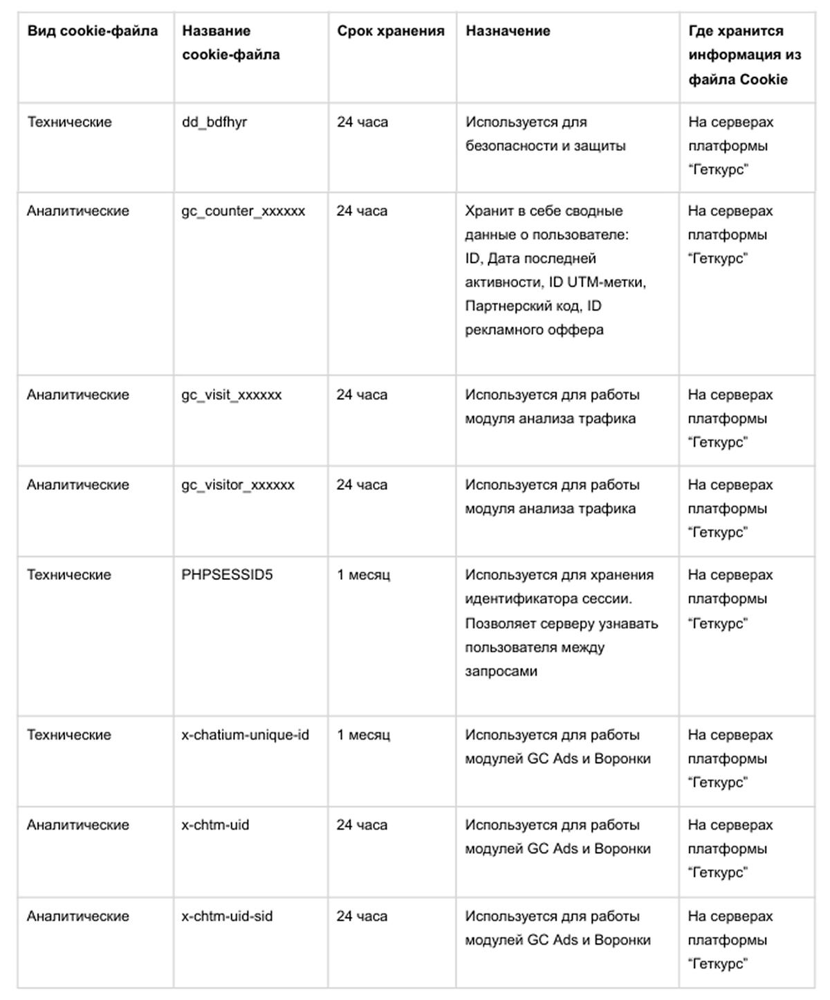 Cookie-файлы устанавливаются Платформой «Геткурс» согласно информации, указанной в таблице: